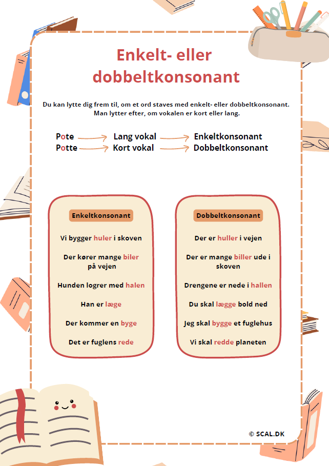 Plakat til træning af enkelt eller dobbeltkonsonant