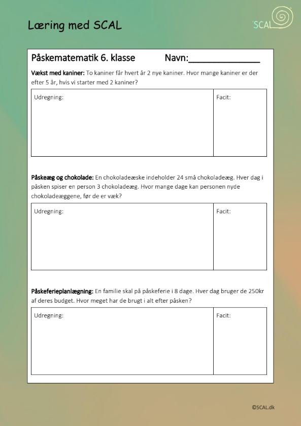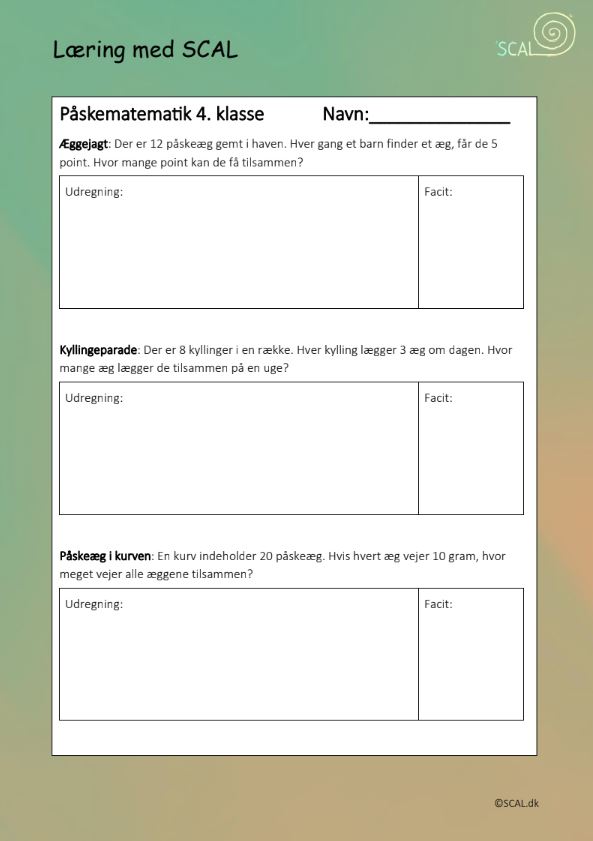 Regnehistorier til henholdsvis 4. og 6. klasse med påsketema. Der er plads til at øve sig i at skrive udregninger og et facit/konklusion.