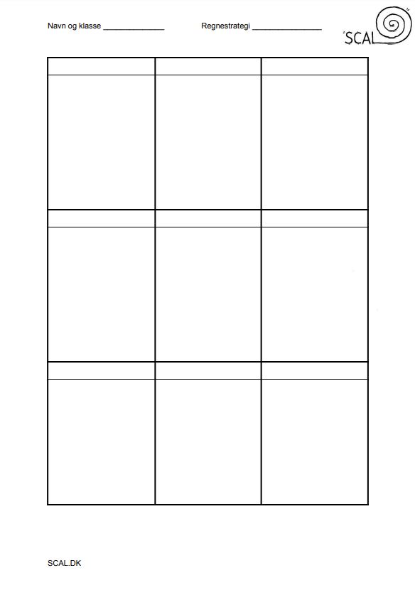Print et ark ud, skriv regnestykker i felterne. Et af regnestykkerne udregnes med den strategi, eleverne skal træne. Kopier så dét ark med opgaverne på til hver elev. Det er også godt at give arkene med hjem, så forældre kan hjælpe med træningen og derved kender strategien eleverne øver.